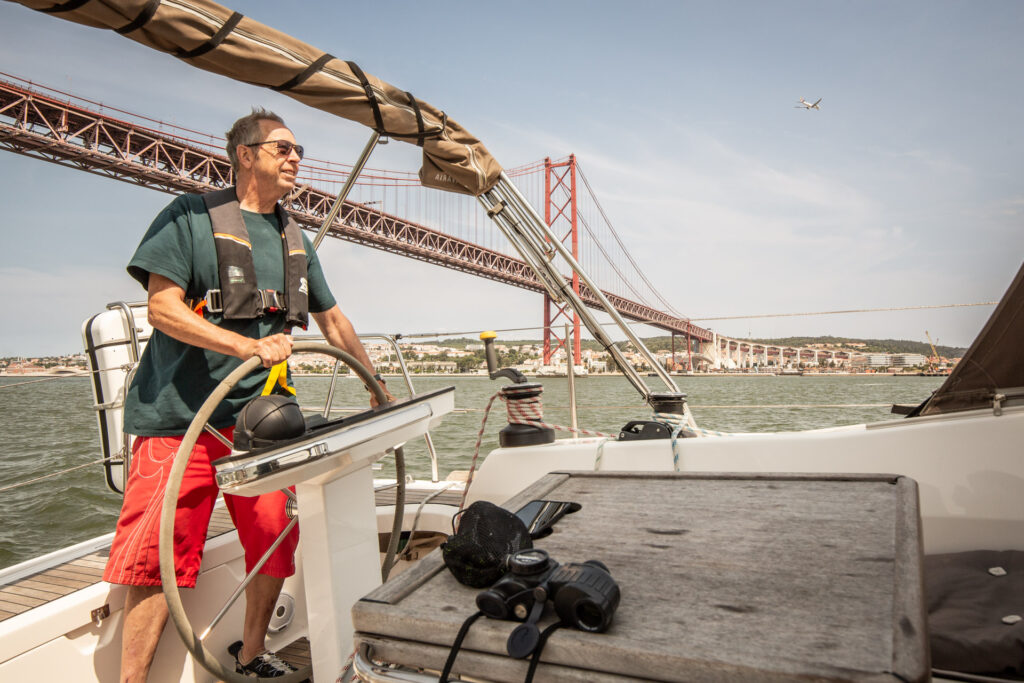 mit Dirk in großen Etappen von Porto nach Lissabon über Figueira da Foz, Nazare, Peniche, Ankern vor Cascais und nach einem Segelschlag bis zu Lissabons Ponte 25 Abril (nach dem Datum der Nelkenrevolution 1974, welche die Diktatur Salazar beendete). Leinen fest in Oeiras.
